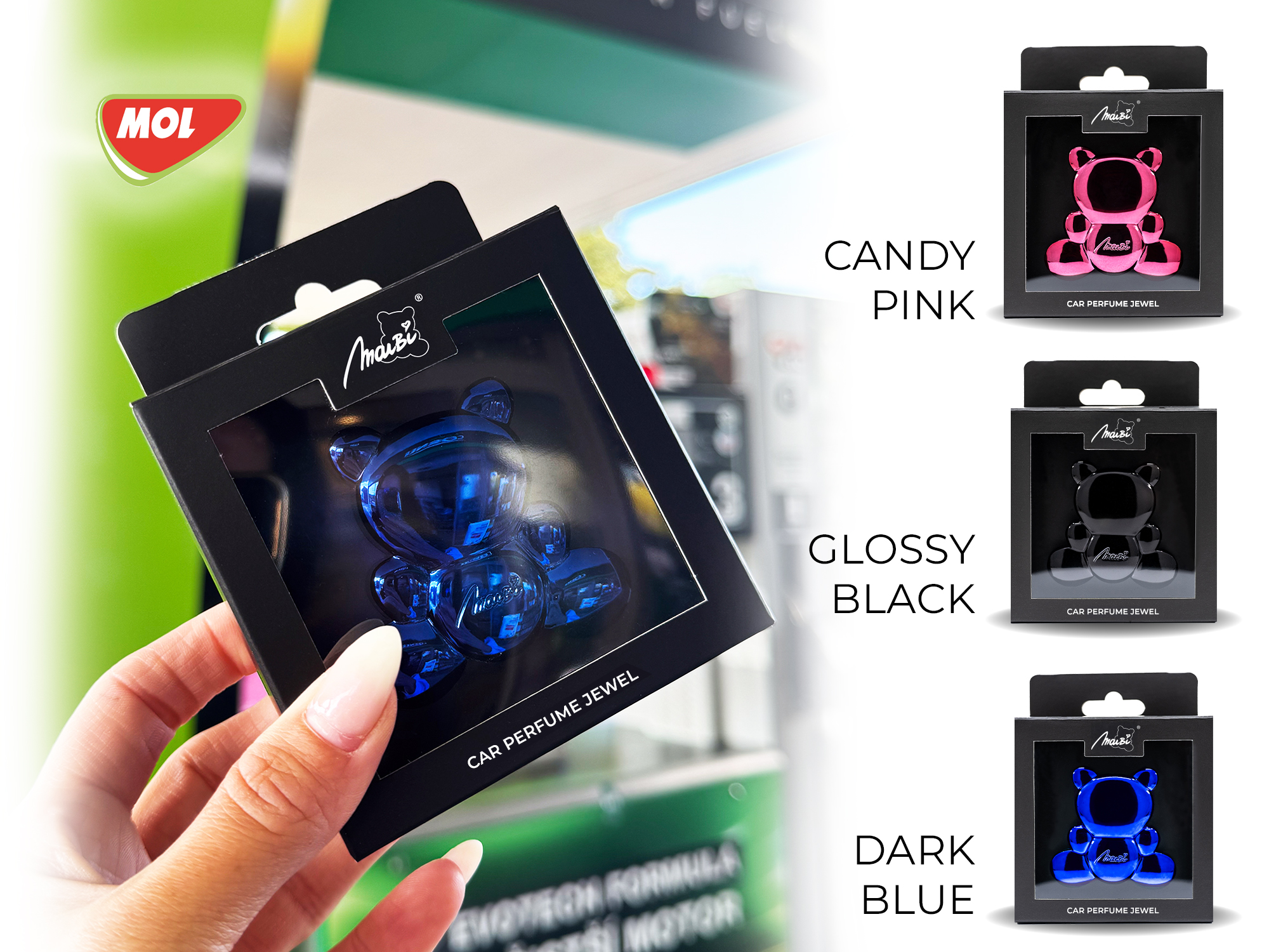 Díky této spolupráci se vonné šperky MaiBi dostávají ještě blíže všem řidičům i milovníkům stylových doplňků. Více něž 300 značkových čerpacích stanic MOL nabízí zákazníkům možnost pořídit si jedinečný vonný šperk, který nejen krásně voní, ale také skvěle vypadá.